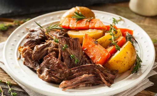 Rôti et ses petits légumes cuits dans une rôtissoire lentement